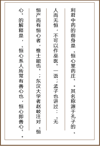 • 利君中藥具有近400年的悠久歷史。公司前身“恒心堂藥莊”始創于明朝末期,興盛于清代、民國,其招牌產品“坎壢妙濟 丹”、“參茸固本還少丹”功能獨特、療效神奇,享譽廣大西部地區,有“神農妙濟”之美譽,歷代名人左宗棠、于佑任、 屈武等都留有書聯贊譽。民國時期,“恒心堂”在西北5省及山西、四川、云南均設有分號,坐大西部藥界,同北京“同仁 堂”、浙江“胡慶余堂”、廣州“陳李記”一起,被稱為“四大藥莊”,是國內為數不多的幾家具有數百年歷史的中藥“老 字號”之一。